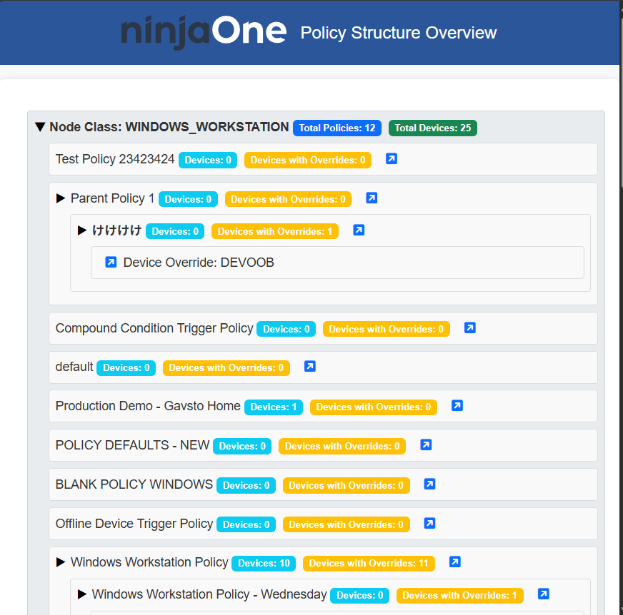 This PowerShell script connects to the NinjaOne API to retrieve and display the policy structure of your NinjaOne environment. It provides an overview of each policy, including the number of devices assigned and any devices with policy overrides. The output is presented in an interactive HTML file.